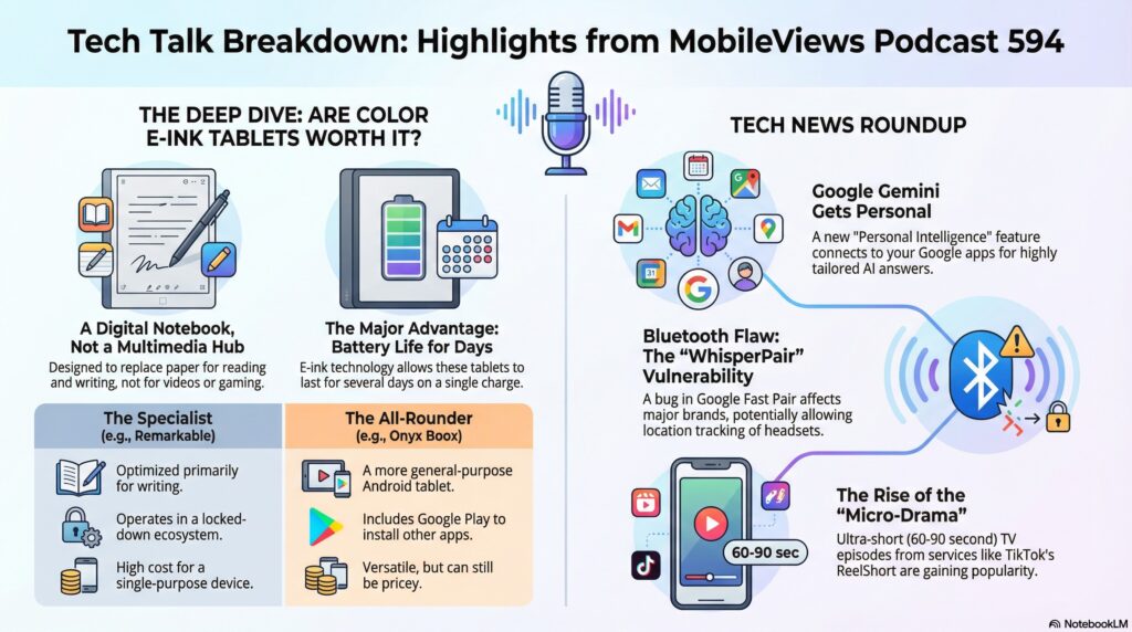 I sat down for MobileViews Podcast 594 with my longtime friends Sven Johannsen and Frank McPherson. Our usual co-host, Jon Westfall, was away, but we had plenty to cover, ranging from the bite-sized future of entertainment to a massive deep dive into the world of color E-ink tablets.