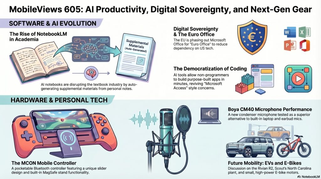 On the hardware front, Jon shared his first impressions of the MCON controller, a slider-style mobile gaming device that features a built-in MagSafe stand. While the buttons are a bit small for some, its “pocketability” makes it a strong contender for travel,. Steve updated us on the Sea Otter Classic, essentially the “CES for bikes,” highlighting new e-bike motors that are rejuvenating the industry,. We also touched on the EV market, specifically the Scout SUV and its move toward a range-extending motor. Steve even noted a great practical tip: using an EV as a reverse-load power source to keep a refrigerator running for up to two weeks during a blackout.