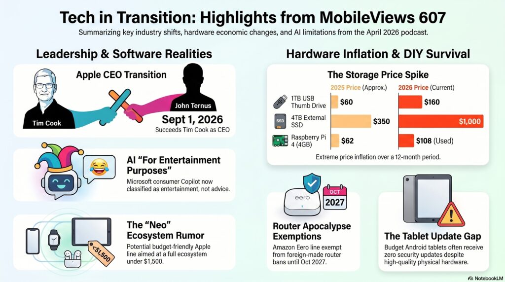 Jon Westfall and I kicked off episode 607 with the news that Tim Cook is stepping down as Apple’s CEO to become Chairman, with John Ternus taking the helm this September. We speculated that his leadership might usher in a full “Neo” ecosystem—budget-friendly iPads and iPhones—that could finally bring the cost of a complete Apple setup under $1,500 for students. Jon is already leaning into this student-centric future by using NotebookLM to “chunk” his 75-minute lectures into digestible videos and activities, a strategy that is saving him hours of summer prep.